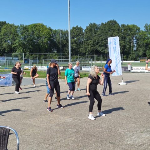 Maar ook binnen in de sporthal van het MFC “de Molenstreek” was het een sportief treffen. Afwisselend kon men een kwartier actief meedoen aan 2 sporten, zoals volleybal, zumba en badminton. Deze onderdelen van SVA worden ’s avonds gegeven. Ook de stuitbal groep deed mee. Zij sporten overdag.