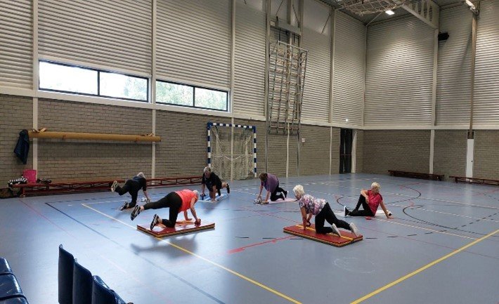 Onder deskundige leiding van Frouk Drent. De warming up bestaat uit rondjes lopen door de sporthal met beenoefeningen. Ook de armen worden opgewarmd tijdens deze loopbewegingen. Daarna worden er op de mat oefeningen gedaan waar alle spiergroepen aan de beurt komen. Elke week weer met afwisselende uitvoeringen. Voordat de cool down aan de beurt is wordt er een spelvorm aangeboden. Soms met bal maar het kan ook wel hersengymnastiek zijn.